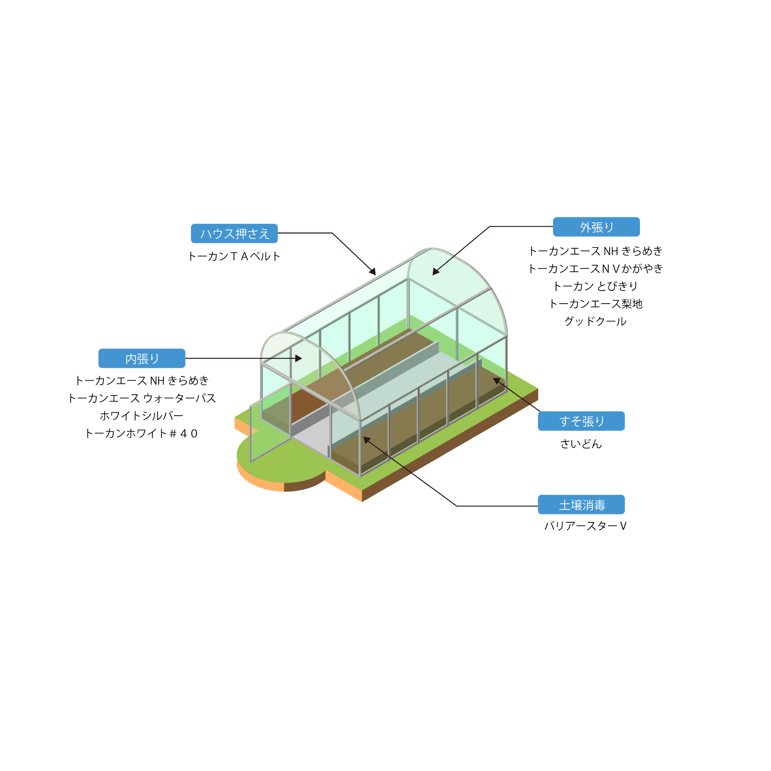 農業用ハウスには大きく分けて、外張りに「フッ素フィルムやガラスを代表する硬質材等を被覆する鉄骨ハウス」と「軟質フィルム等を被覆するパイプハウス」の2種類があります。 特に「パイプハウス」においては「農業用ポリオレフィンフィルム」等を外張りに被覆資材として利用しており、当社製品も「パイプハウス」の外張り分野にご使用頂いています。現在は農POフィルムが外張り被覆材として主流となりつつあります。 当社製品は内張り分野においては「パイプハウス」及び「鉄骨ハウス」でも保温・遮光・遮熱等の各種目的でご使用頂いております。 各種ハウスは作物栽培だけに留まらず、倉庫や作業所、鶏舎等様々な形で利用されています。お気軽にご相談下さい。