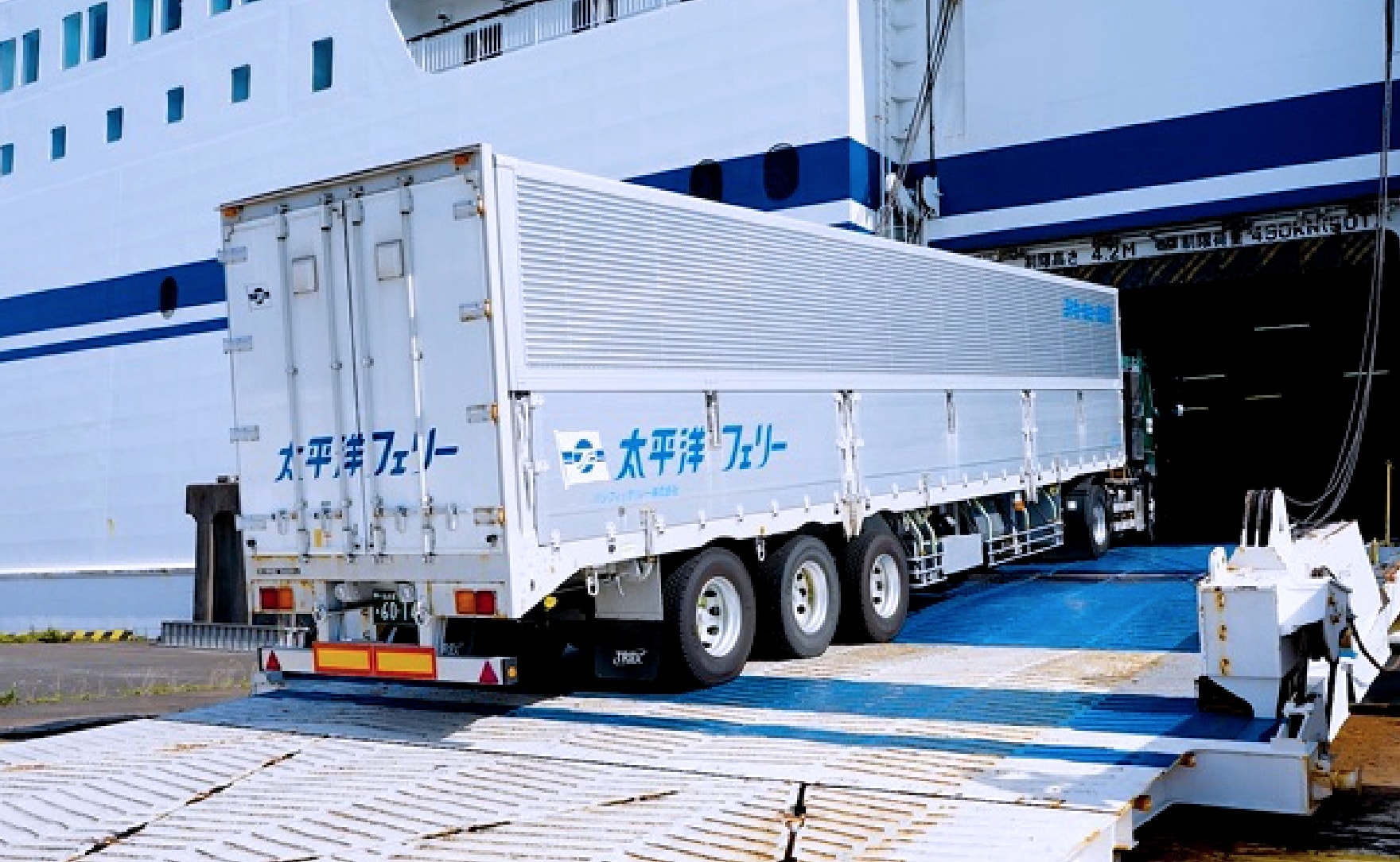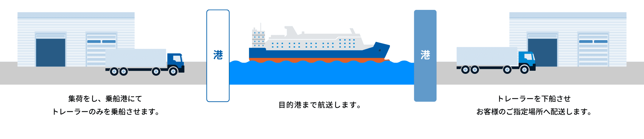 集荷から配達までの間、国内の主要航路を利用し、12フィートコンテナやRORO船によるトレーラーのみを航送する海陸複合一貫輸送です。海上を利用する輸送のため輸送中の製品へのダメージは少なく、高い安全性を確立しています。