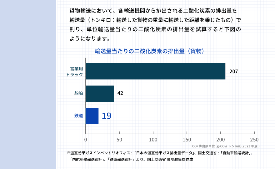 以下の図は物流の各輸送モードが1トンの貨物を1Km運ぶ際に排出される二酸化炭素量を示しています。鉄道輸送は輸送単位当りの温室効果ガス排出量は営業用トラックの約11分の1となっており、物流における環境負荷低減に最適です。