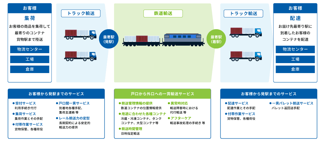 集荷先からお届け先まで鉄道コンテナによる複合一貫輸送に対応。北海道から九州まで全国の貨物専用駅による鉄道ネットワークをワンストップで利用可能。お客様のご要望に適した12フィート、20フィート、31フィートのコンテナをご用意いたします。